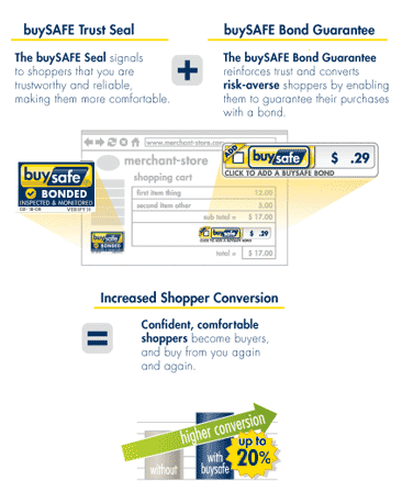Unfortunately, most shoppers don't feel safe and confident when buying online - because it's tough for them to know which merchants to trust. Online shoppers are nervous. This costs merchants like you a lot of money every day. To effectively compete, you need all your shoppers to feel 100% confident when visiting your website. You need buySAFE! buySAFE provides the only explicit, third-party endorsement of a merchant's trustworthiness and reliability - backed by a bond guarantee.